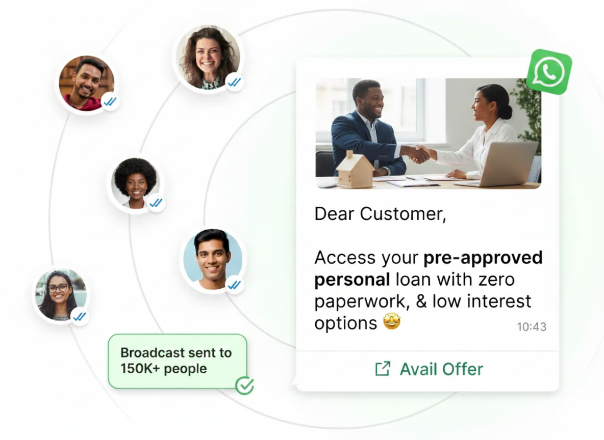 Take advantage of WhatsApp’s impressive 98% message read rate and 45-60% click-through rate to broadcast personalized loan and insurance offers directly to your customers.